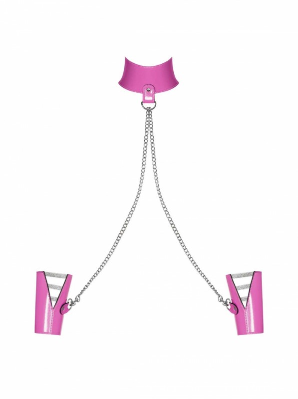 Выполненные из высококачественной экокожи в нежно розовом цвете широкий ошейник с кольцом и широкие манжеты-наручники - приведут в восторг каждую женщину! Между собой соединяются при помощи металлической цепи