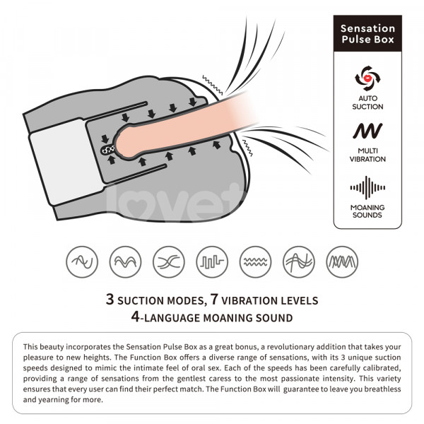 Мастурбатор имеет 7 разнообразных режимов вибрации, 3 режима вакуума и голосовое сопровождение на 4 языках!